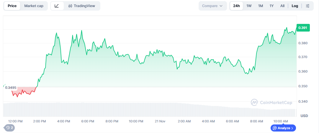 Con un volume di $71 milioni e il livello di ritracciamento di Fibonacci al 23,6% ($0,350) ora trasformato in supporto, ESPORTS mostra un livello di resilienza strutturale. La chiusura sopra il massimo di novembre a $0,410 potrebbe aprire la strada verso il livello di estensione al 127,2% a $0,479.