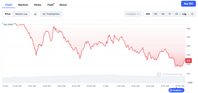Zcash (ZEC), una delle criptovalute più rinomate focalizzate sulla privacy, sta attraversando una fase di forte ribasso che continua ad aggravarsi. Nelle ultime 24 ore, il token ha registrato un calo dell’11,7%, estendendo le perdite settimanali al 35,9% e portando il prezzo a circa 323 dollari.