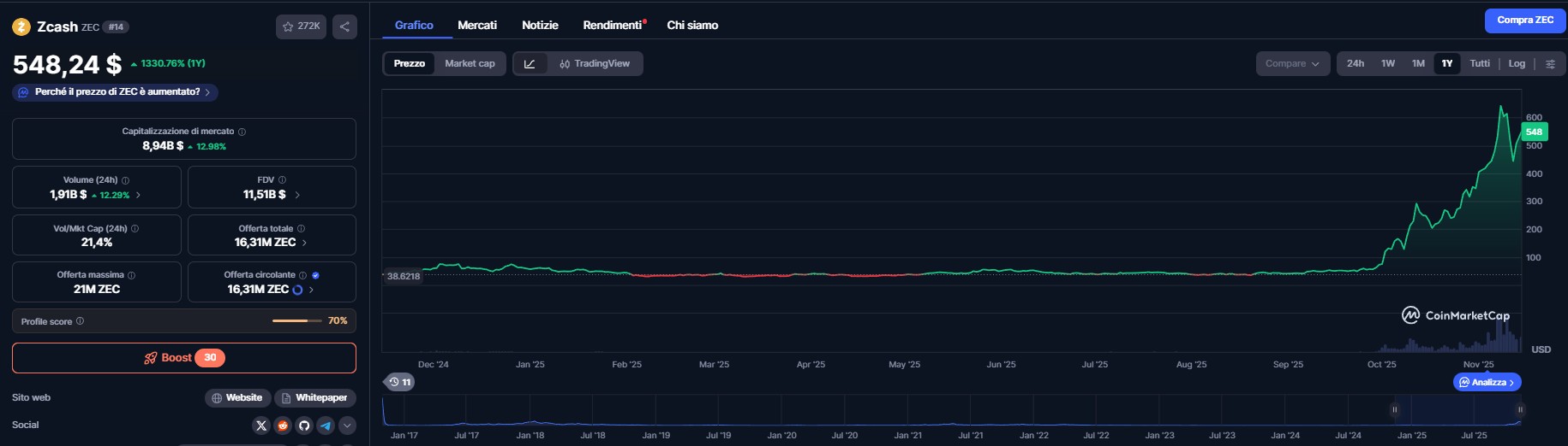 Nel frattempo, Zcash ha messo a segno un 10X in un solo mese, un movimento che non si vedeva da anni e che non può essere liquidato come un sussulto speculativo.