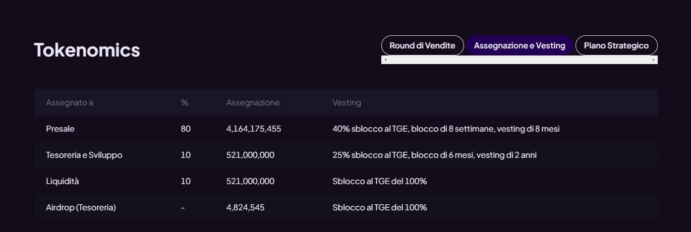 Il restante 10% dei token è stato destinato alla liquidità di scambio e Il restante 10% alla tesoreria e sviluppo.