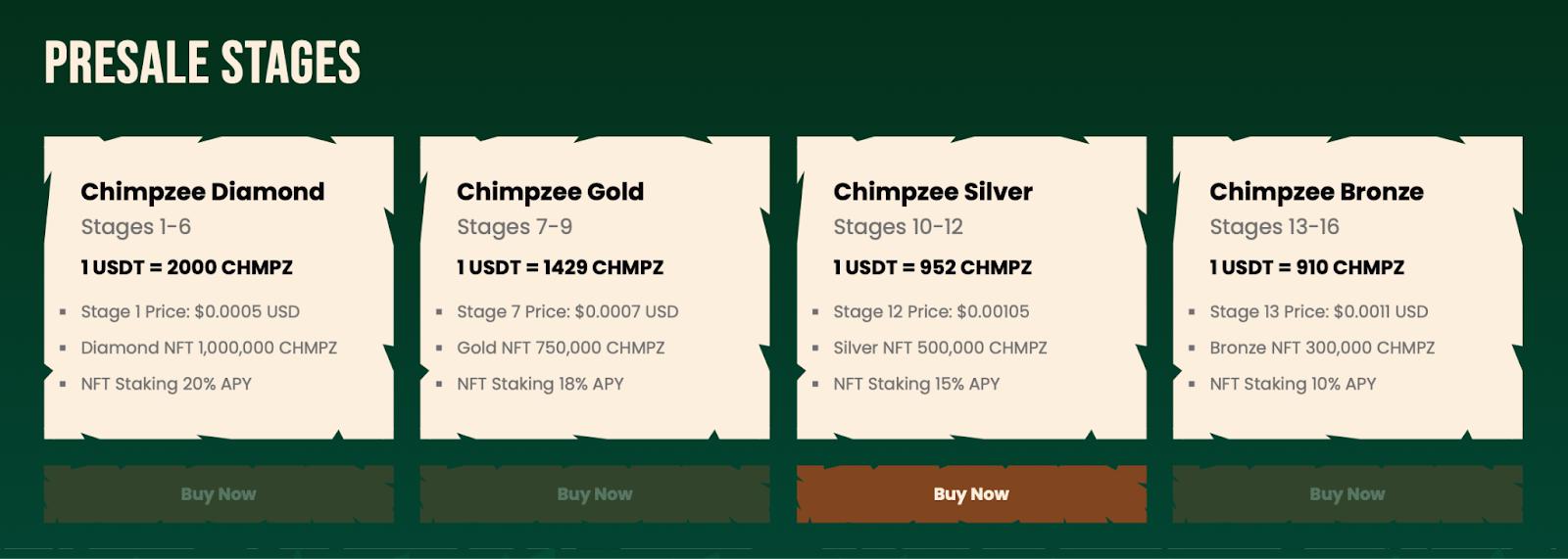 Essendo stata concepita per massimizzare il potenziale di rendimento per gli investitori, Chimpzee è una delle migliori criptovalute da acquistare ora. Inoltre, le ampie opportunità di partnership globali con marchi e organizzazioni che si occupano di sostenibilità e conservazione della fauna selvatica conferiscono a Chimpzee un notevole potenziale di crescita.
