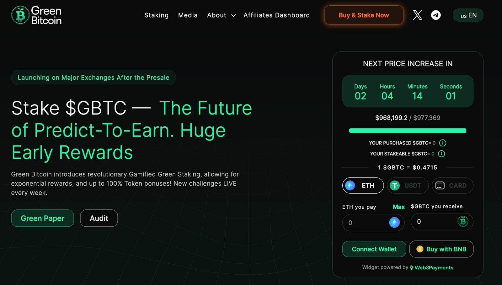 Cresce l’interesse nei confronti di Green Bitcoin ($GBTC) e gli investitori sembrano aver compreso il grosso potenziale dell’ecosistema predict-to-earn. Ora la raccolta fondi ha superato il traguardo del primo milione di dollari e continua a crescere.