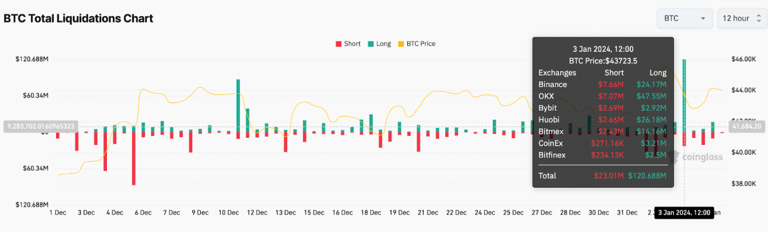 Il mercato dei derivati di Bitcoin ha visto sparire ben 500 milioni di dollari. Stando ai dati elaborati da Coinglass, il 3 gennaio sono state liquidate posizioni long per 120 milioni di dollari: