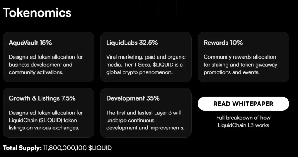 総供給量は11,800,000,100 LIQUIDに設定されています。割り当ては、長期的な開発、エコシステムの拡大、およびコミュニティへのインセンティブを支援するために分配されます。