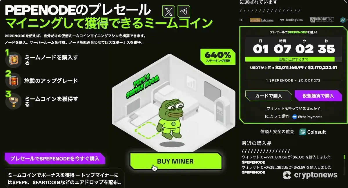 PEPENODEは、ETH、BNB、USDT(ERC-20およびBEP-20)、さらにはクレジットカードやデビットカードを使用して購入可能。