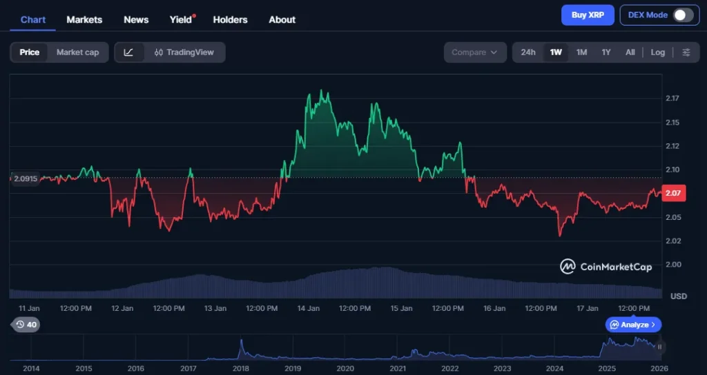 XRP価格は、過去数日間2.02ドルから2.17ドルの間で推移しました。この範囲は拡大ではなく、保ち合いを示しています。