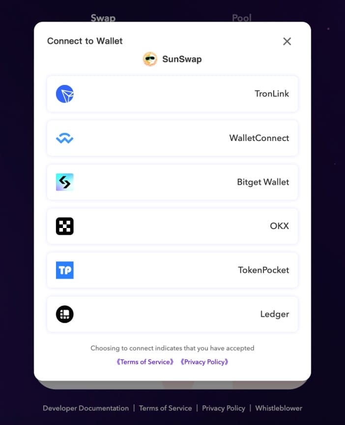 3단계: 썬스왑 방문 및 트론링크 지갑 연결