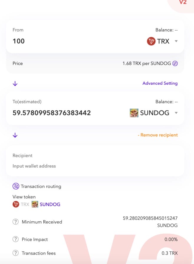 이제 썬스왑에서 토큰 스왑을 진행합니다. 먼저 ‘From(발신)’ 칸에 TRX를 입력합니다. 밈코인의 계약 주소를 ‘To(수신)’ 칸에 붙여넣습니다. 이제 교환하려는 TRX 토큰 수를 입력합니다.
