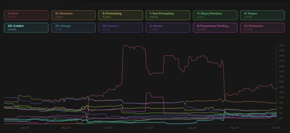 전망 작성 시점 기준 TAO 코인의 네트워크는 32개의 서브넷으로 구성되어 있으며, 각 서브넷에는 특정 목적을 위해 구현된 AI 모델이 있습니다. 텍스트 응답, 이미지 생성, 웹 스크래핑 등을 위한 서브넷이 포함됩니다.