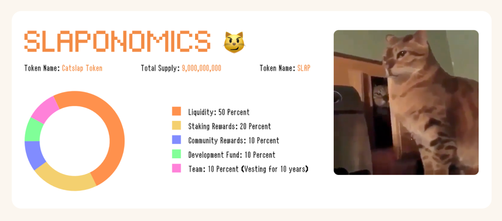 캣슬랩은 “슬랩(싸대기)을 좋아하는 고양이”를 테마로 하며 공정 토큰 출시를 위해 유니스왑에 직접 상장되었습니다. 총 공급량은 90억 개이며 이더리움 블록체인에서 작동합니다.