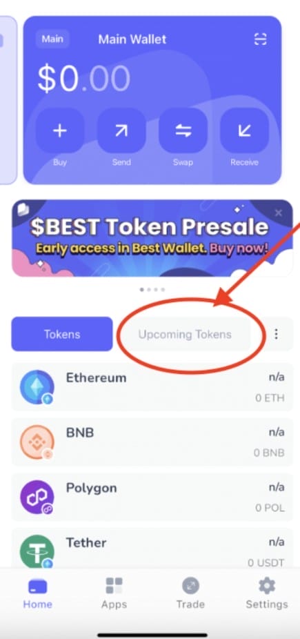ETH를 구매했으니 이제 캣슬랩을 구매할 준비가 되었습니다. 베스트 월렛 앱에서 “Upcoming Tokens” 버튼을 찾으세요.