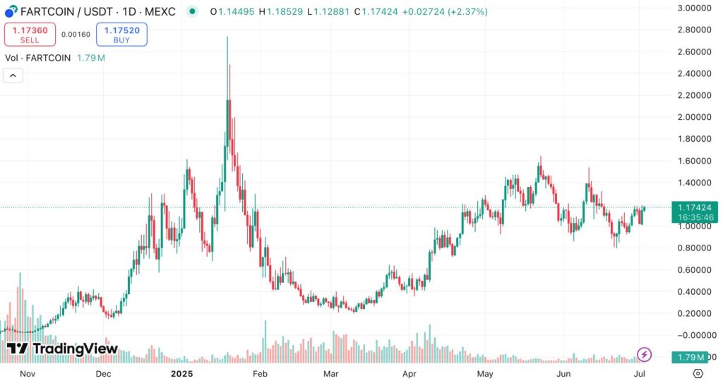 파트코인(FARTCOIN)은 시장 혼란을 견디면 수익을 가져다 준 좋은 예입니다. 토큰6900과 유사한 특성을 탑재한 투기성 밈코인인 파트코인은 0.00367달러에서 0.35달러까지 상승했다가 약 50% 하락하여 0.18달러 저점을 기록했습니다. 그리고 몇 달 후 사상 최고가인 2.61달러에 도달하며 다음 상승 사이클에 진입했고 토큰을 조기에 매도한 투자자들은 71,000% 이상의 수익률을 놓쳤습니다.