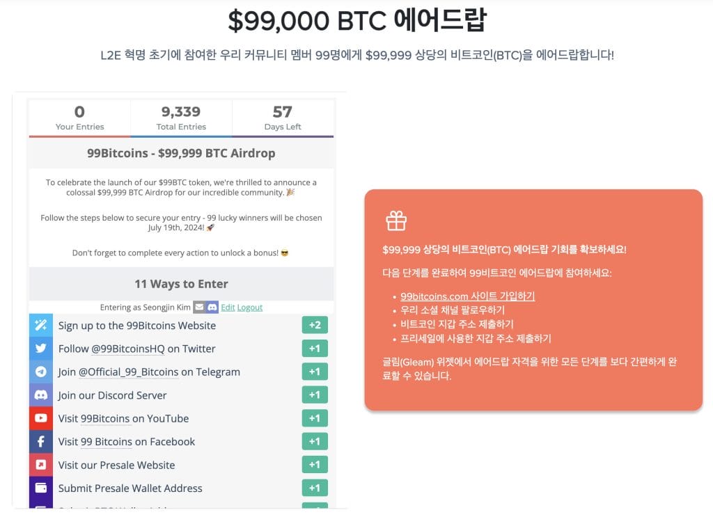 현재 99비트코인은 사전판매 외에도 99,999 달러상당의 비트코인(BTC) 에어드랍 이벤트를 진행 중이다. 이는 공식 웹사이트에서 참여 가능하다.