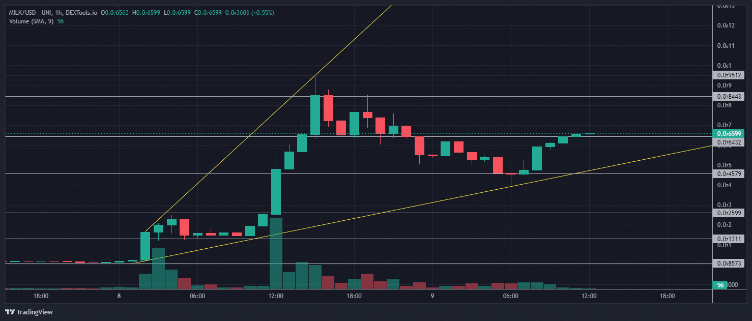 거래자들이 새로운 수익을 실현함에 따라 밀크코인 가격은 0.00000000458 달러로 다시 하락했지만, 이 또한 빠르게 반등했다.