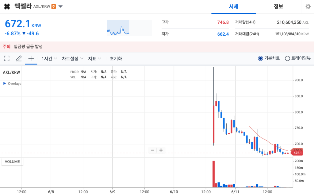 해당 공지와 함께 빗썸, 바이낸스 등 국내외 거래소에서 시세가 급등했으며 빗썸에서는 약 460원에서 846원까지 80% 이상 치솟았다. 온체인 거래를 보면 업비트 핫월렛에 다섯 번의 거래에 걸쳐 150만 AXL이 입금되었으며 (약 1,970만 달러) 이때부터 AXL 가격이 급등하기 시작했다.