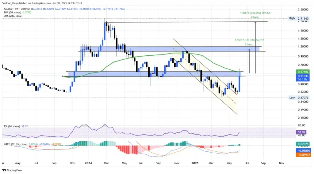엑셀라 코인 주봉 차트를 보면 어제 업비트 상장 호재에 AXL 가격이 50일 단순이동평균선(SMA)이 위치한 $0.575을 향해 상승 돌파했다. 엑셀라 코인은 지난해 $2.713까지 치솟았지만 2025년 4월 초 $0.2745에서 최저가를 기록했다.