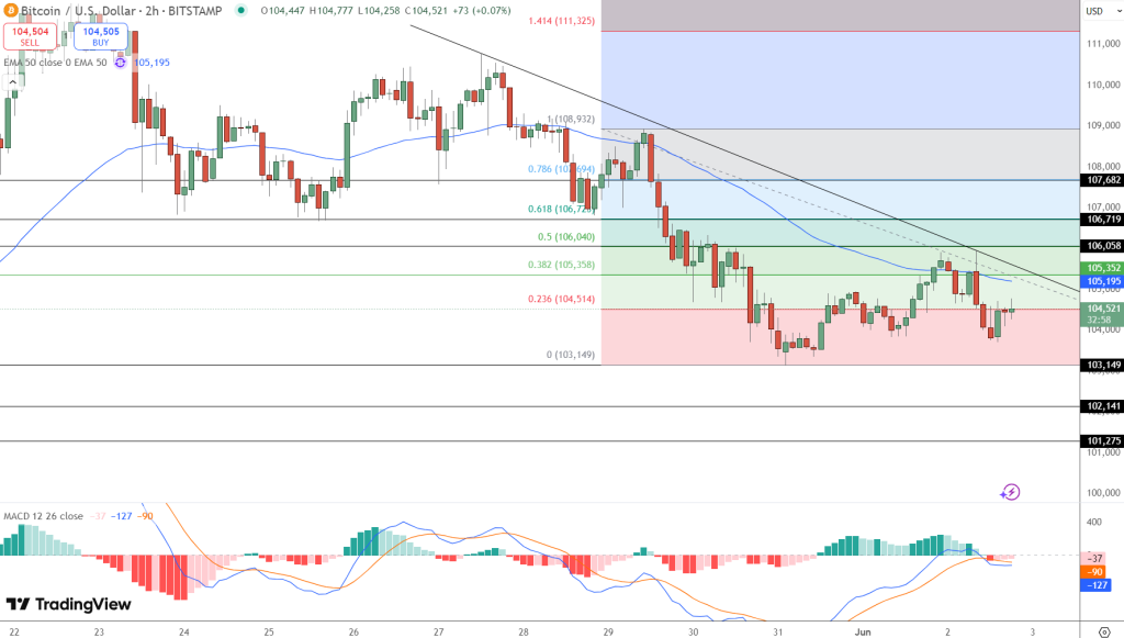 비트코인 2시간봉 차트를 보면 비트코인이 하락 쐐기형 패턴을 형성하고 있다. 흔히 하락 쐐기형 패턴은 강세 반전을 예고하는 차트 패턴으로 알려졌다. 38.2% 피보나치 되돌림 및 50EMA가 만나는 10만 5,352에 저항선이 형성되어있다.