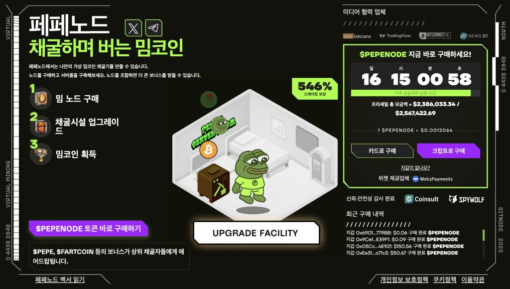 한편 페페노드(PEPENODE)는 바이럴한 밈 문화와 게임 요소를 결합한 차세대 밈코인 프로젝트로 주목받고 있다. 현재 프리세일을 진행 중이며 모금액은 255만 달러를 돌파했고 프리세일 물량이 빠르게 감소하면서 마무리 단계에 진입했다. 이에 따라 투자자 관심도 더욱 높아지고 있다.