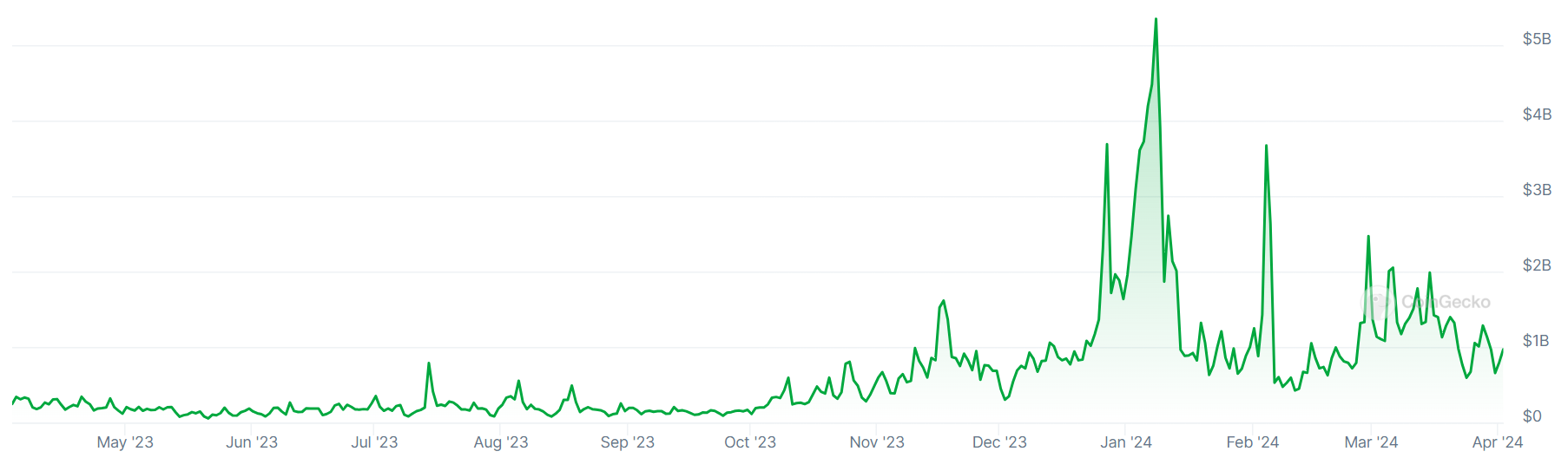 A graph showing trading volumes on South Korea’s Upbit crypto exchange over the past 12 months.