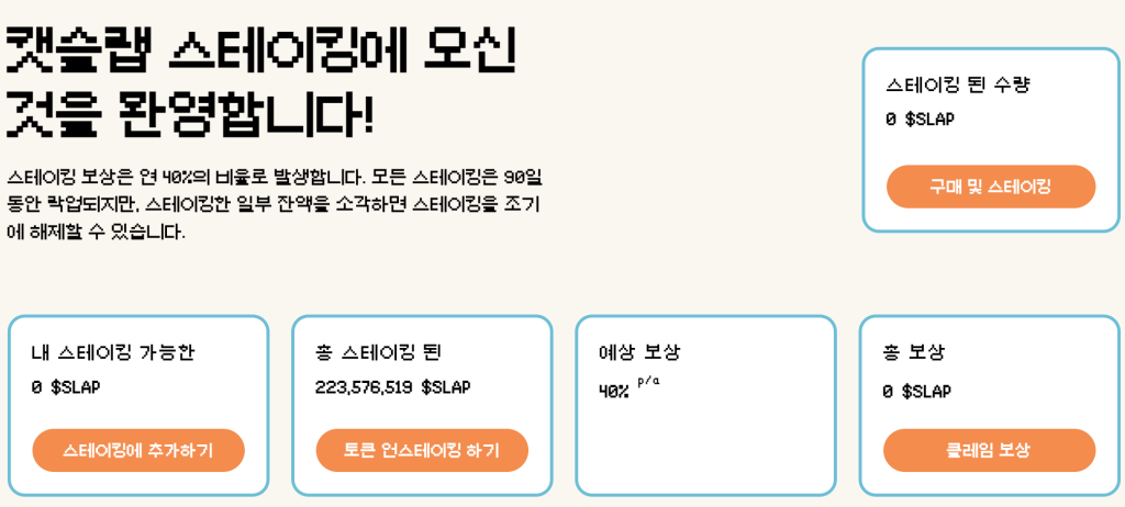 캣슬랩 홈페이지에 들어가면 DEX 위젯으로 바로 $SLAP 토큰을 구매할 수 있으며 스테이킹까지 가능하다. 스테이킹 보상률은 연 40%로 높다. 7일 동안 토큰이 락업되지만, 조기 언스테이킹을 원할 경우 일부 토큰을 소각하는 조건으로 자금을 회수할 수 있다. 이러한 구조는 장기 투자를 유도하면서도 투자자에게 유연성을 제공한다. 또한 토큰 소각 메커니즘을 도입해 디플레이션 자산이 된다. 지금까지 2억 2,000만 개 이상의 $SLAP이 예치되었다.
