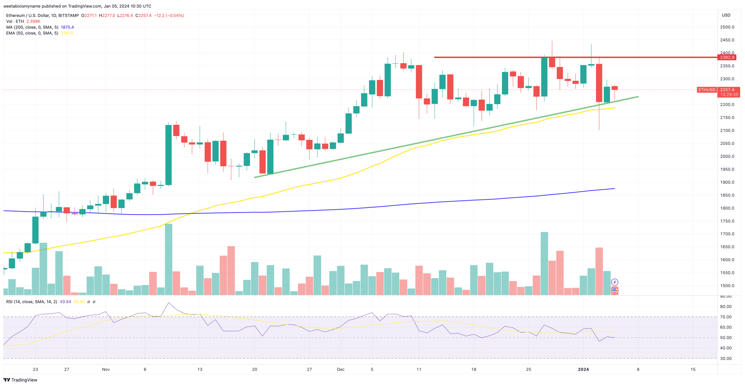 동시에, ETH의 상대강도지수(RSI, 보라색)는 현재 50 주변을 유지하고 있으며, 12월 초부터 높았다.