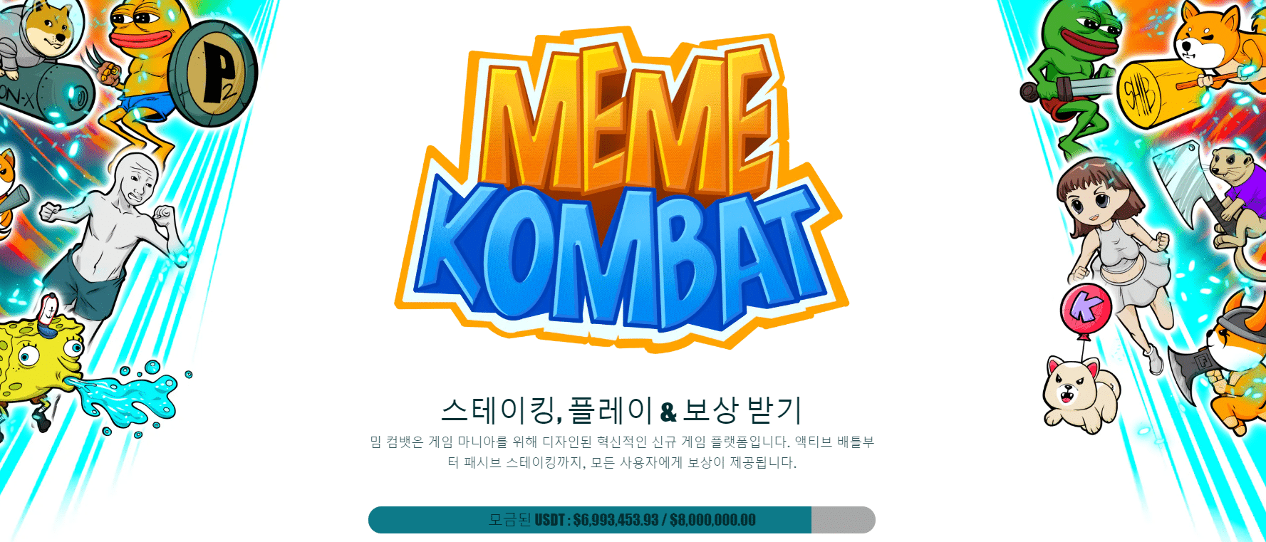 밈 컴뱃($MK)은 다양한 밈 캐릭터들이 등장하여 서로 배틀을 펼치는 P2E 게임 플랫폼이며, 플레이어는 승패에 따라 보상을 획득할 수 있다. 최대 천만 달러를 목표로 삼고 있는 MK 사전 판매는 짧은 시간 안에 700만 달러 모금을 달성하고 있다.