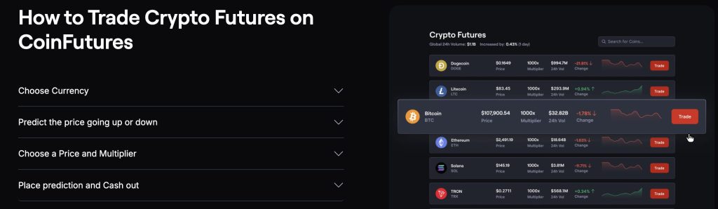 코인퓨처스(CoinFutures)는 비트코인, 이더리움 등 주요 암호화폐의 단기 움직임을 트레이딩하는 것과 유사한 게임이다.