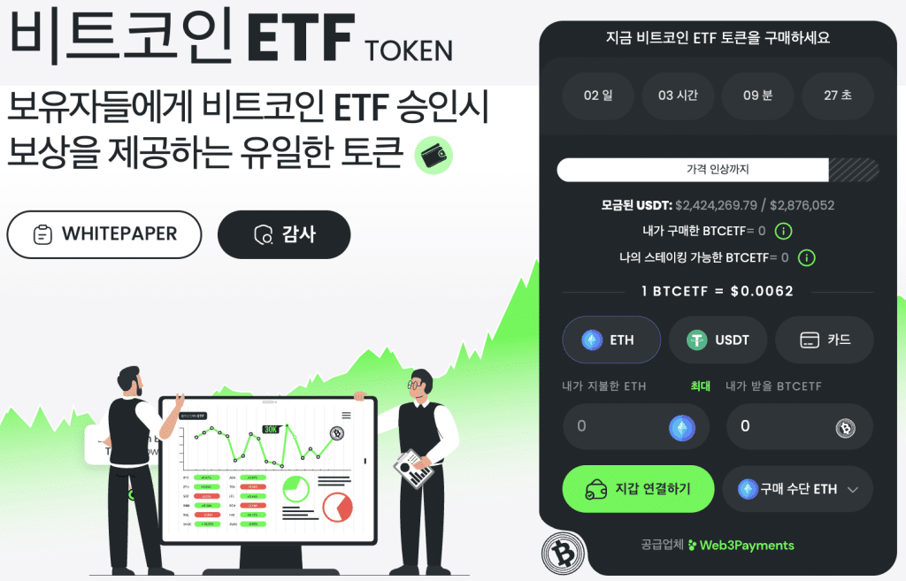비트코인 ETF 토큰은 독특한 실용성으로 한 달도 되지 않아 이미 240만 달러를 모금하는 등 사전판매에서 좋은 성과를 보이고 있다. btcetftoken.com에서 진행되고 있는 현재 사전판매 단계는 수요일에 종료될 예정이며, 이후 토큰 가격은 인상된다. BTCETF는 기사 작성 시점 기준으로 0.0062달러에 구매 가능하다.