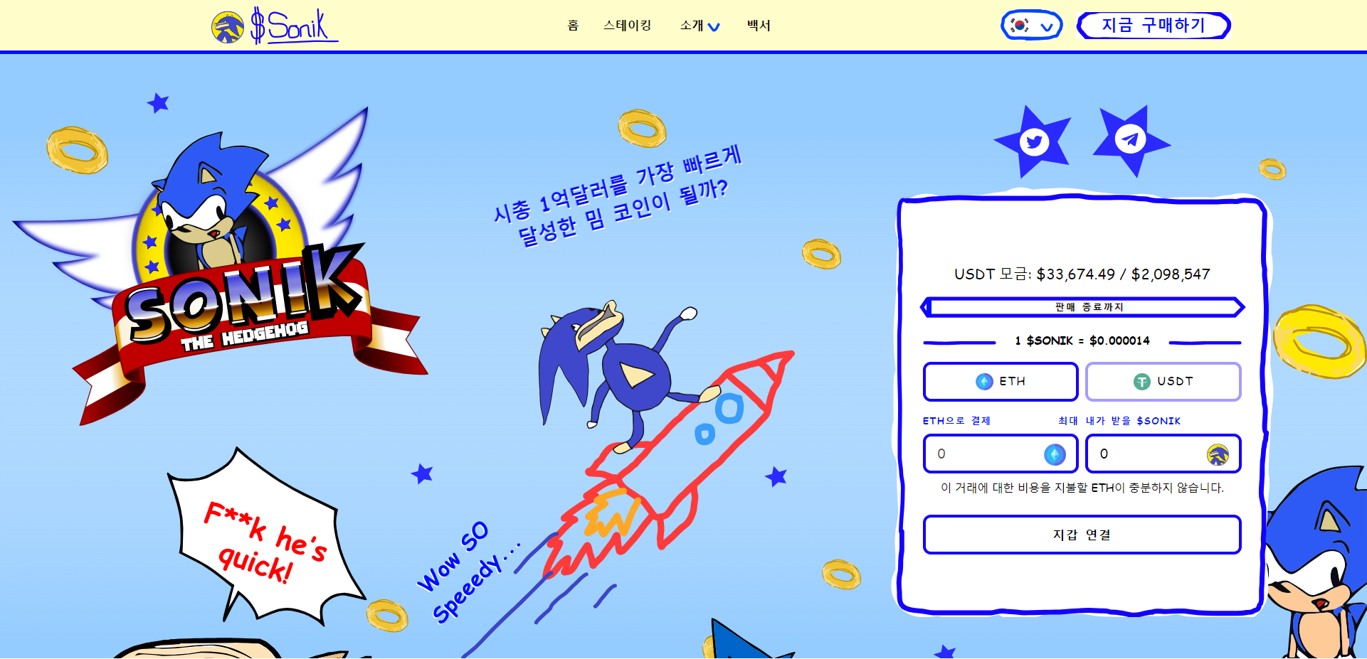 대박조짐이 보이는 또 다른 코인은 바로 SONIK이다. 이것은 우리에게 익숙한 게임 캐릭터 소닉을 기반으로 탄생한 밈코인이며, 사전 판매가 시작된 지 단 몇 시간 만에 14,000달러를 모금하며 승승장구하고 있다.