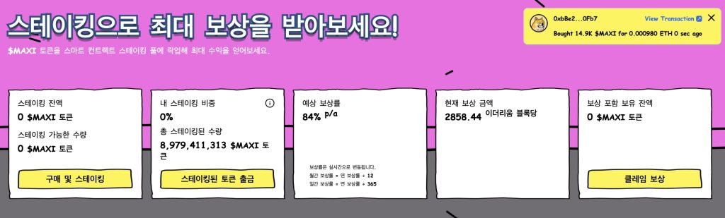 MAXI 프리세일은 360만 달러 이상 모금했으며 예상 보상률 APY 84%의 스테이킹 풀도 제공한다. 인상적 성장 속도와 강력한 보상의 조합 덕분에 일부 트레이더는 차기 대세 밈코인으로 예측하기도 했다.