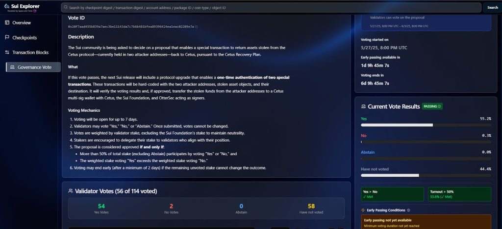 27일, 수이 네트워크의 자체 탈중앙화 거래소(DEX)인 세투스(Cetus)가 해킹당해 2억 2,300만 달러상당이 손실됐으며 이를 전액 회수하기 위한 대규모 거래를 승인하는 온체인 투표가 7일간 진행된다.