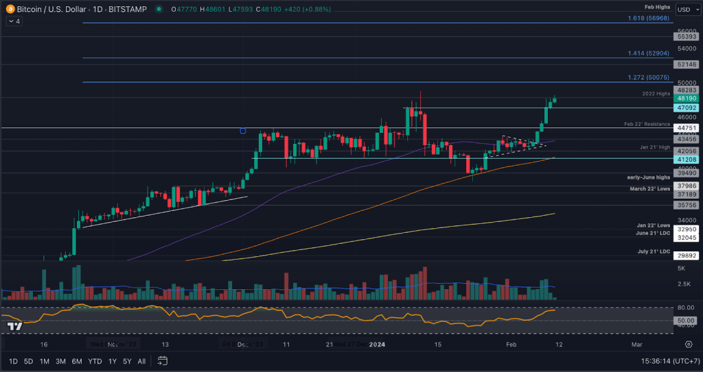 비트코인 가격 예측: ETF 붐 및 경제 위기 경고에 4만 7,000달러 위로 우뚝 솟아