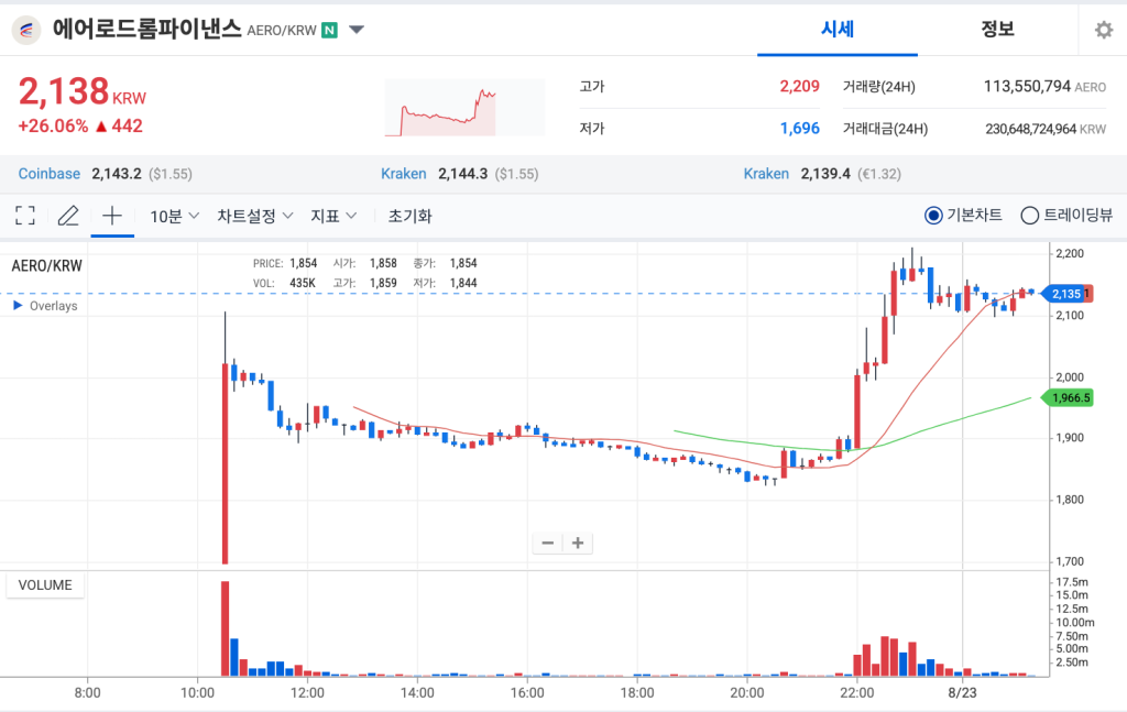 업비트에서 거래가 개시된 직후 AERO 코인 가격은 2,106원까지 치솟았다가 전일 종가 아래인 1,696원까지 서서히 하락하고 거래량도 감소했다. 그러나 금요일(현지 시간) 와이오밍주에서 열린 잭슨홀 미팅에서 제롬 파월 연준 의장이 9월 금리 인하 가능성을 강력하게 시사하면서 급격히 가상자산 시장으로 자금이 유입되었으며 이에 따라 에어로드롬파이낸스 코인도 다시 상승 추세를 시작했다.