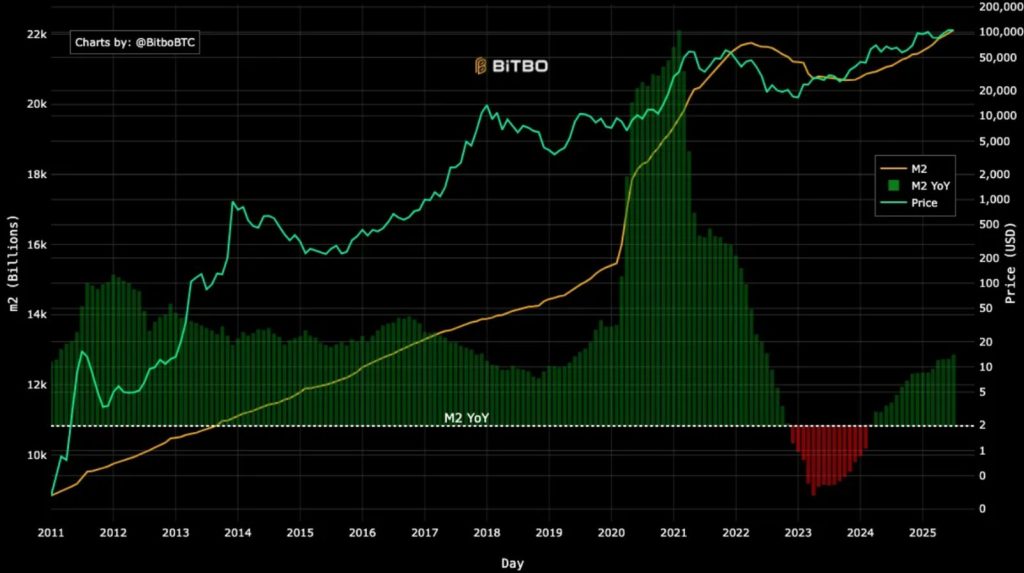 역사적으로 금리 인하는 달러 약세로 이어지며 이는 비트코인 가격에 유리하게 작용하는 경향이 있다. 그동안 미국의 M2 통화 공급량은 비트코인 가격과 평행선으로 움직이는 추세를 보여 비트코인이 달러 가치 하락에 대한 대체 자산으로 간주되고 있다고 보여주었다.
