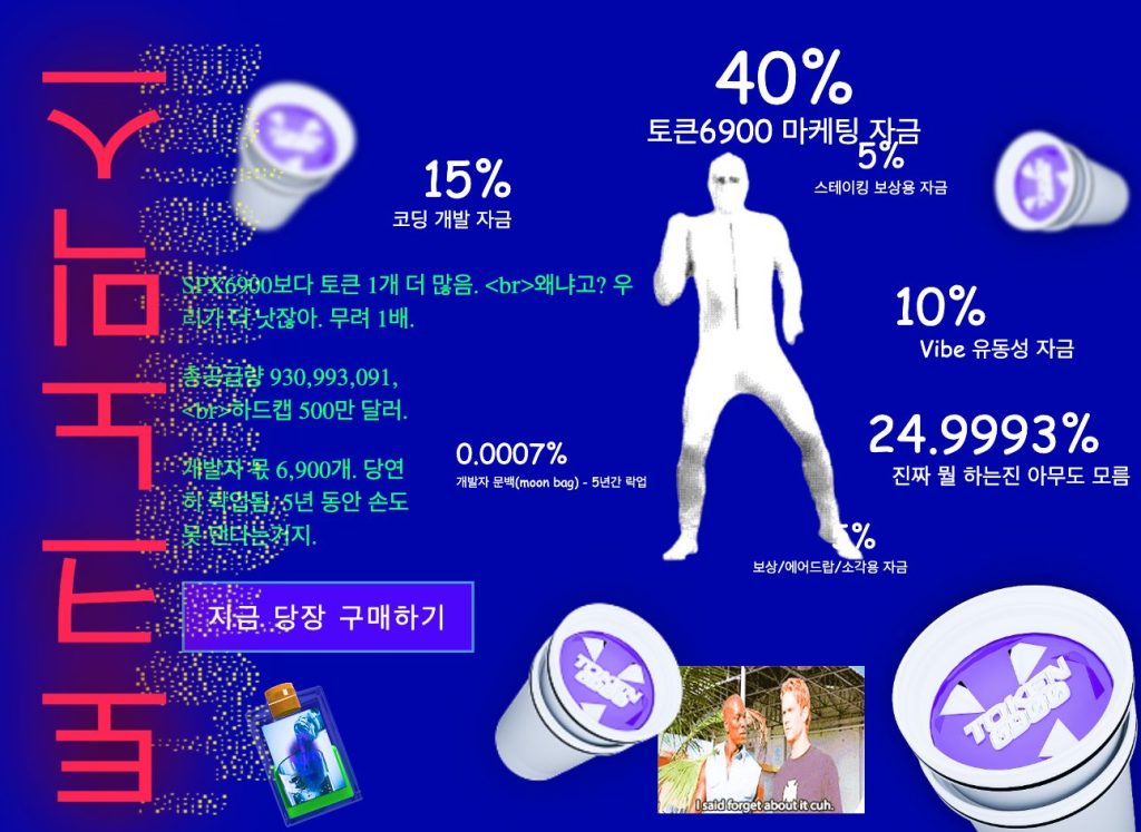 SPX6900은 미국의 대표 주가지수인 S&P 500등 전통 금융시장을 조롱할 목적으로 탄생한 밈코인으로 엄청난 성장을 하며 밈코인 시장에서 한 획을 그었다. 그리고 그 뒤를 이을 토큰6900은 더욱 강력한 순수 광기 밈코인이다.