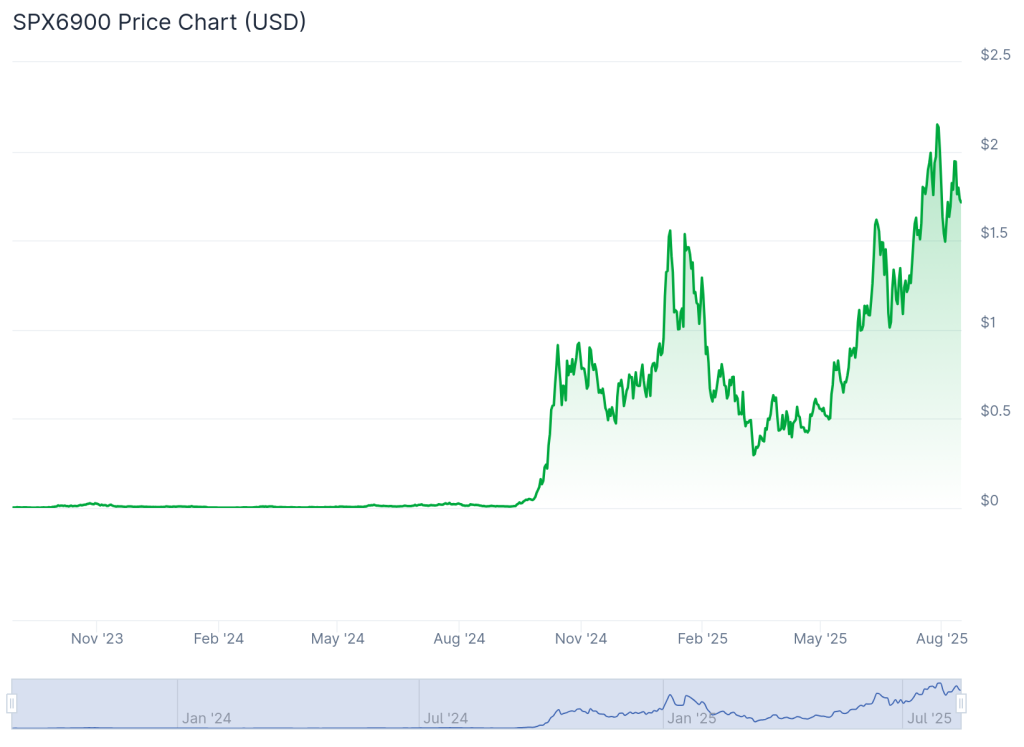 SPX6900을 놓친 사람들도 같은 감정을 느끼고 있지만 훨씬 최근의 일일 뿐이다. 코인게코 데이터에 따르면 SPX6900의 사상 최저가는 작년 2월 0.001318달러다. SPX6900 가격은 사상 최저가 대비 현재 무려 13만 % 이상 상승한 상태다.