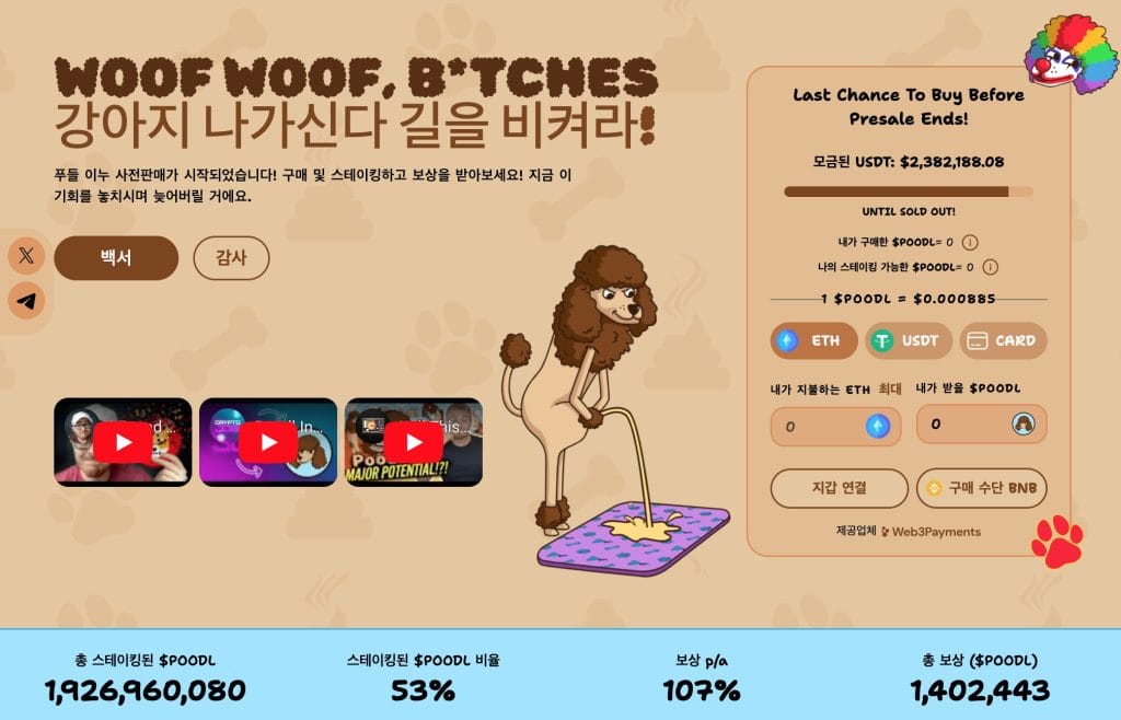 푸들 이누 홈페이지에서 토큰 구매 및 스테이킹: 푸들 이누에 본격적으로 참여할 준비가 되었는가? 이제 POODL 토큰을 구매할 수 있는 유일한 웹사이트인 푸들 이누 공식 홈페이지에 접속한다. 여기서 ETH, USDT, BNB 혹은 신용 카드로 POODL을 구매할 수 있다. 구매 직후 스테이킹 풀에 토큰을 예치해 지속적 보상도 받을 수 있다. POODL 수령하기: 사전 판매가 종료된 후에는 구매한 푸들 이누 토큰과 그동안 축적한 스테이킹 보상을 받을 수 있다. 명확한 참여 방법과 기하급수적 성장 가능성을 가진 푸들 이누 사전 판매는 차기 대세 밈코인에 참여할 기회를 제공한다. 전 세계 코인 커뮤니티가 푸들 이누의 거래소 상장만 기다리고 있어서 미래가 기대되며, 개발팀도 이에 부합하기 위해 로드맵을 꾸준히 실천해가고 있다. 앞으로 POODL가 어디까지 갈 수 있을지 주시할 필요가 있으며, 주요 커뮤니티 소식은 X나 텔레그램에서 가장 먼저 확인할 수 있다.