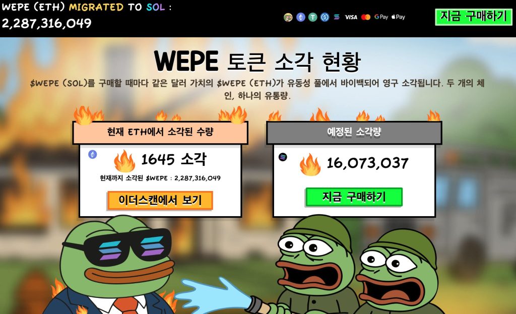 솔라나 마이그레이션과 동시에 이더리움 체인에서는 소각이 진행된다. 월스트리트페페 웹사이트에서 누군가 솔라나 WEPE를 구매할 때마다 동일 수량의 토큰이 이더리움 체인 위에서 소각된다.