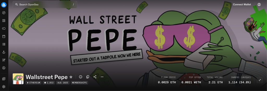 인상적 이정표를 기록한 데 이어 월스트리트페페는 첫 NFT 컬렉션에 대한 공개 판매도 개시했다.
