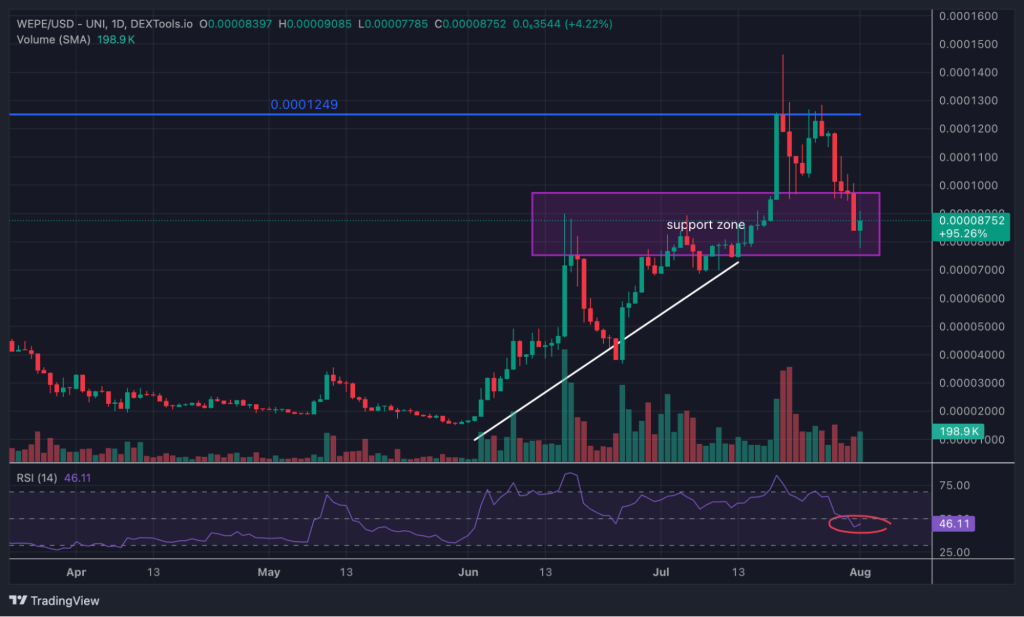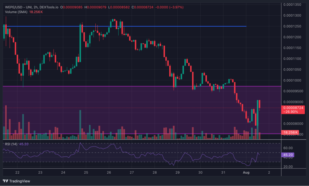 시장 하향조정은 WEPE 투자자들이 통제할 수 있는 요인이 아니지만 기술적 설정에 따르면 현재 가격 0.00008752달러에서 강력한 지지선이 형성돼 하락세가 심화될 가능성은 낮다.