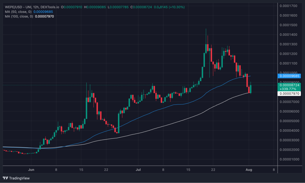 50일 및 100일 이동 평균선(MA)을 살펴보면 WEPE 토큰 보유자와 재진입을 원하는 사람들에게 좋은 소식을 전한다.