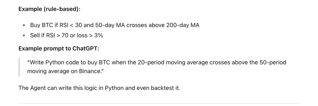 OpenAI introduced “ChatGPT Agent” in mid‑2025. This virtual AI worker is able to perform multi‑step workflows to facilitate crypto trades. The agent can also monitor charts, execute simple trading strategies, generate alerts, read dashboards, and more.