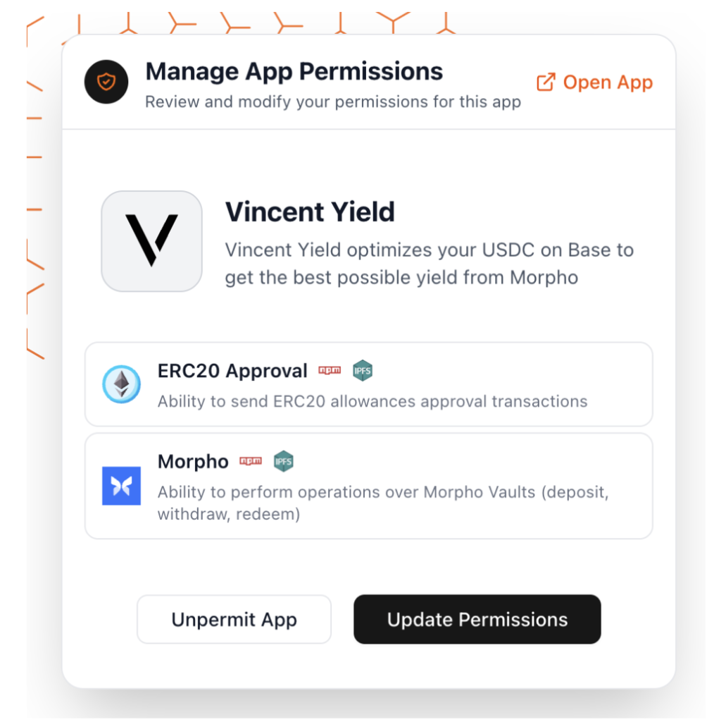 For users, Vincent provides the ability to grant permissions and let agents or automations work safely within on-chain guardrails. Users get a clear dashboard to manage all their connected agents, policies, and wallets, providing visibility and control over automation that’s usually hidden in traditional apps.