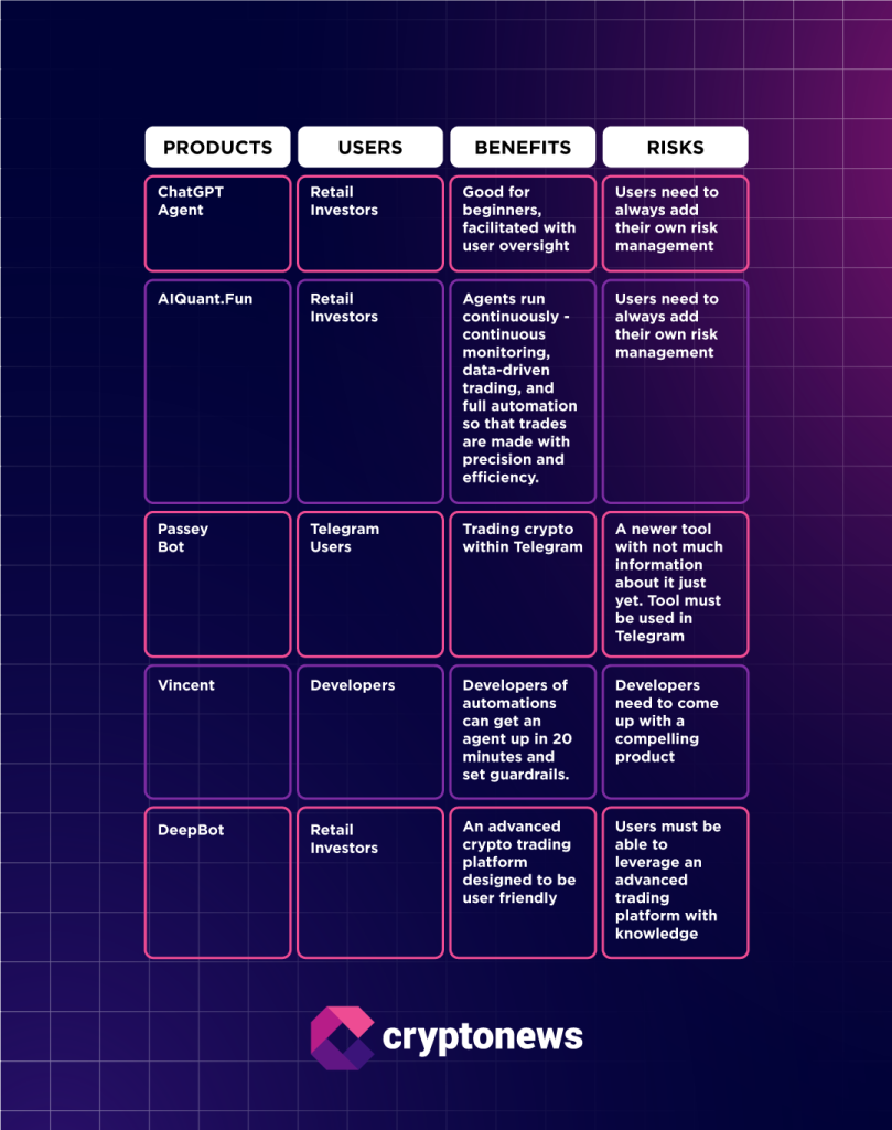 Although AI agents and bots are being used more often for crypto trading, it’s important for users to do their own research to determine which tools are best for their needs. While this feature showcases five different tools, there are many options available. Also, while tools are becoming more advanced, human intervention and skill remain an important part of the equation.