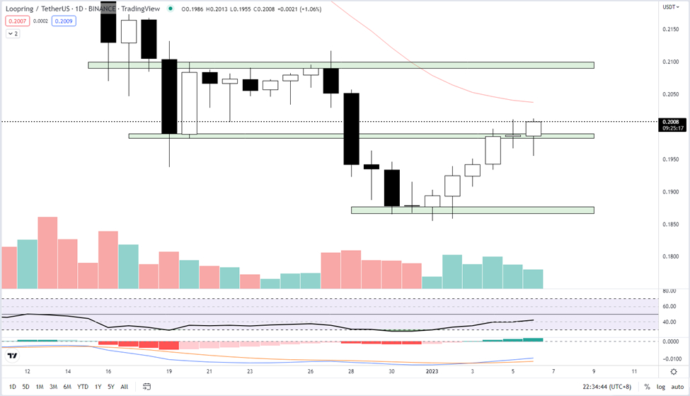LRC is trading at $0.2008 as of writing and is up by 0.86% in the past 24 hours. It’s trading around the previous support area turned resistance between $0.1982 to $0.1989. If this area holds as a support, the next immediate resistances are the 20-day EMA at $0.2037 and the resistance range of $0.2090 to $0.21.