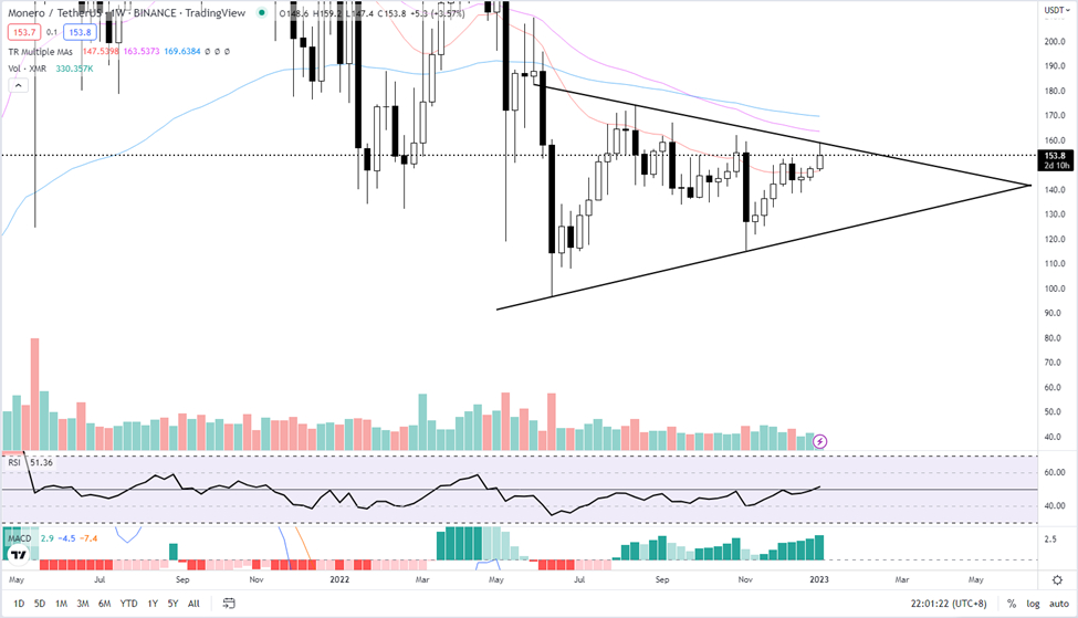 XMR has been on a healthy uptrend for the past few weeks with the cryptocurrency up by 8.19% since December. Checking its weekly timeframe charts reveals that the RSI is making a move to finally break above the significant level of RSI 50. The last time it was around this level was back in May 2022.