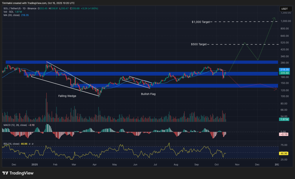 Currently trading at $205, SOL finds strong support around $150, while resistance near $250 is the key barrier to another breakout. If momentum continues, Solana could revisit its ATH of $293.31, and ETF news could drive it past $500 before 2025 wraps up.