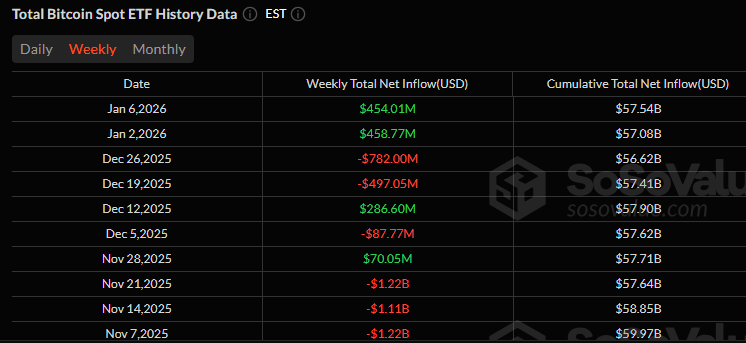 SoSoValue data shows that despite the one-day drawdown, cumulative net inflows across all U.S. spot Bitcoin ETFs stood at $57.54 billion since launch.