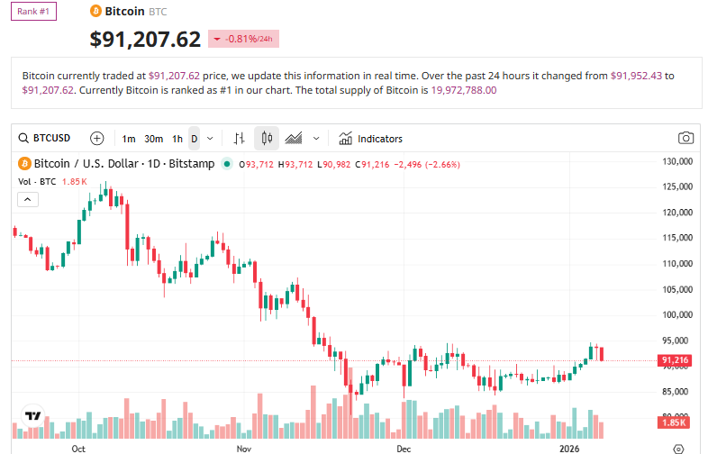 Bitcoin itself has shown resilience despite ETF volatility. The asset is trading around $91,119, up 3.1% over the past 24 hours, with daily trading volume rising more than 22% to $61.56 billion.
