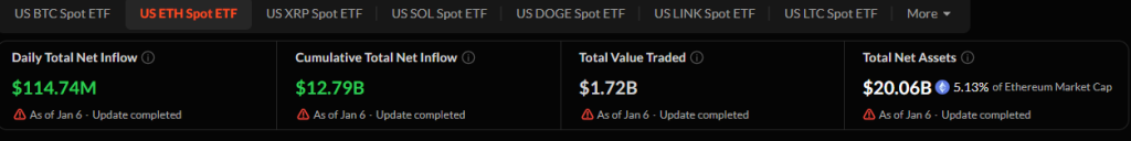 Meanwhile, Ethereum spot ETFs continued to attract capital. U.S. ETH ETFs recorded $114.74 million in net inflows on the same day Bitcoin products saw outflows, lifting cumulative ETH inflows to $12.79 billion.